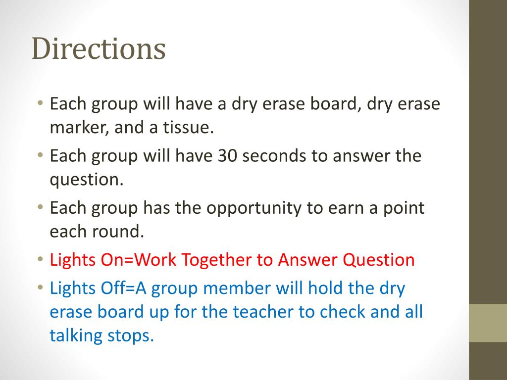 Directions • Each group will have a dry erase board, dry erase marker, and a tissue. • Each group will have 30 seconds to answer the question. • Each group has the opportunity to earn a point each round. • Lights On=Work Together to Answer Question • Lights Off=A group member will hold the dry erase board up for the teacher to check and all talking stops.