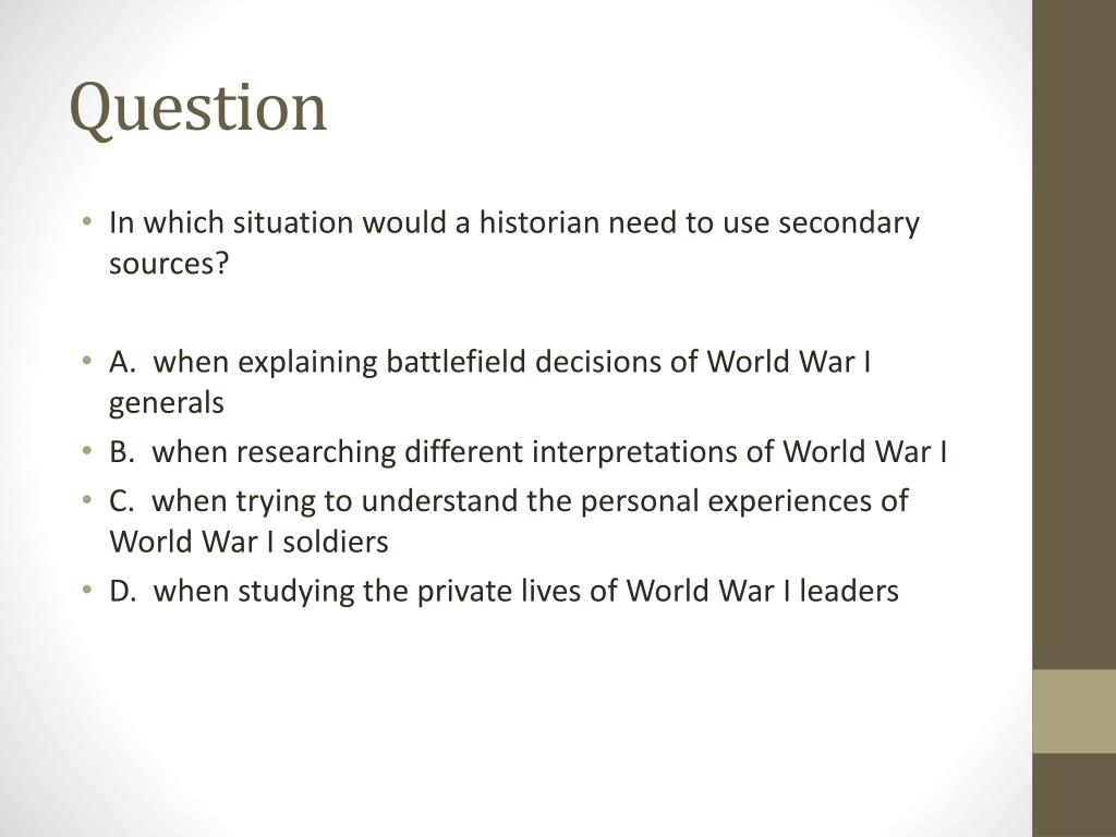 Question • In which situation would a historian need to use secondary sources? • A. when explaining battlefield decisions of World War I generals • B. when researching different interpretations of World War I • C. when trying to understand the personal experiences of World War I soldiers • D. when studying the private lives of World War I leaders