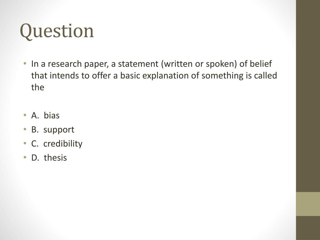 Question • In a research paper, a statement (written or spoken) of belief that intends to offer a basic explanation of something is called the • A. bias • B. support • C. credibility • D. thesis