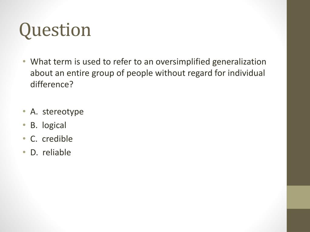Question • What term is used to refer to an oversimplified generalization about an entire group of people without regard for individual difference? • A. stereotype • B. logical • C. credible • D. reliable