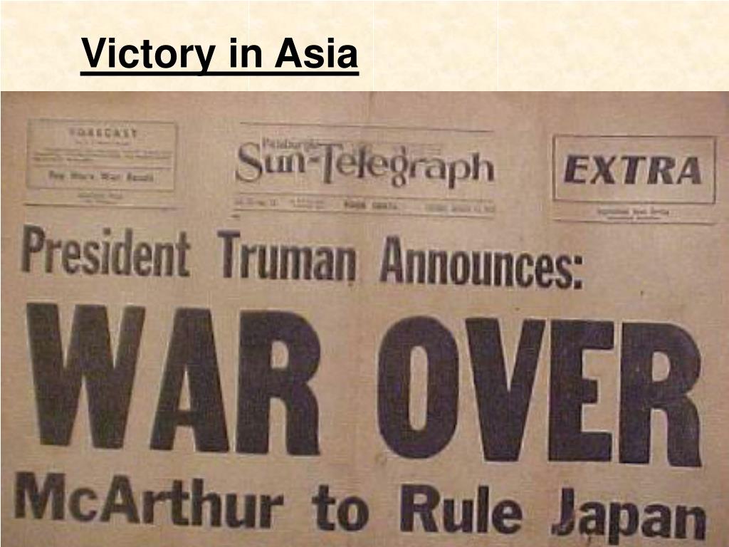 Victory in Asia. Election of 1944. · FDR won an unprecedented fourth term in office in 1944. · However, in April of 1945, FDR died, forcing Vice-President Harry Truman to assume the Presidency .