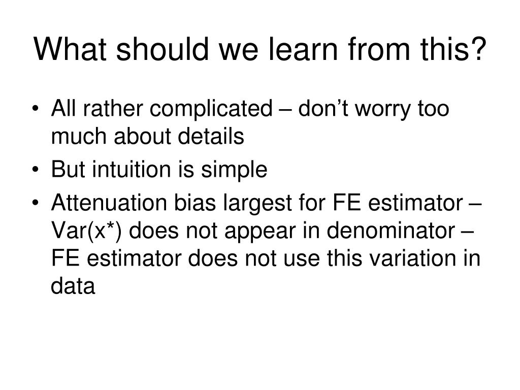 What should we learn from this? • All rather complicated – don’t worry too much about details • But intuition is simple • Attenuation bias largest for FE estimator – Var(x*) does not appear in denominator – FE estimator does not use this variation in data