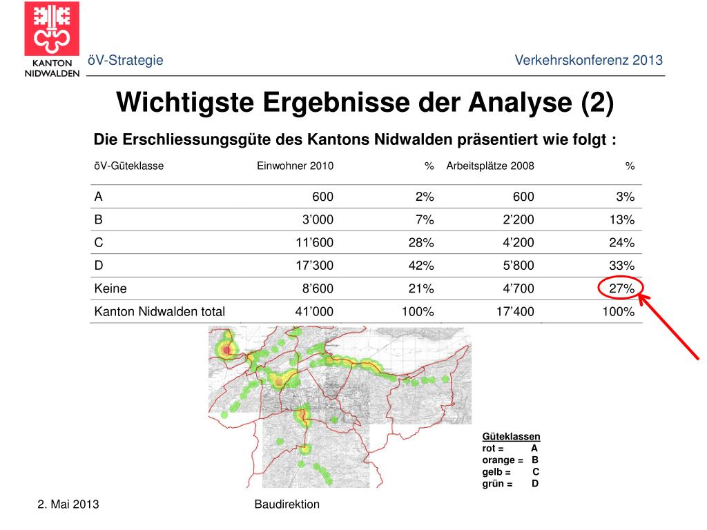 öV-Strategie Verkehrskonferenz 2013 Wichtigste Ergebnisse der Analyse (2) Die Erschliessungsgüte des Kantons Nidwalden präsentiert wie folgt : Güteklassen rot = A orange = B gelb = C grün = D 2. Mai 2013 Baudirektion