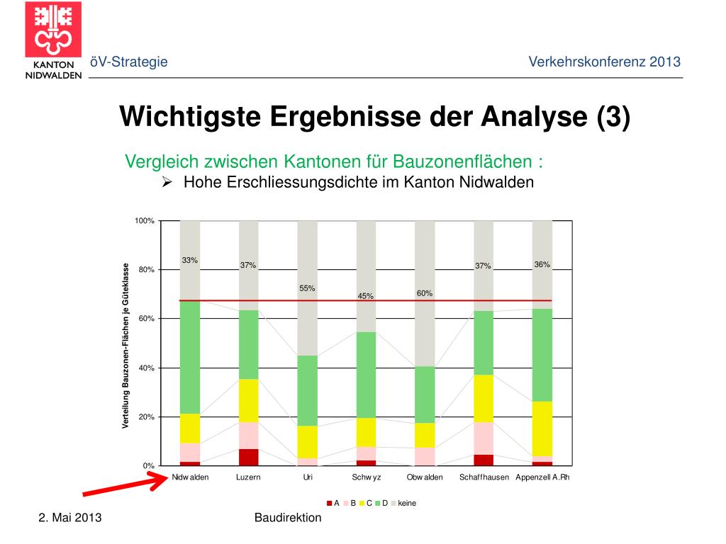 öV-Strategie Verkehrskonferenz 2013 Wichtigste Ergebnisse der Analyse (3) • Vergleich zwischen Kantonen für Bauzonenflächen : • Hohe Erschliessungsdichte im Kanton Nidwalden 2. Mai 2013 Baudirektion