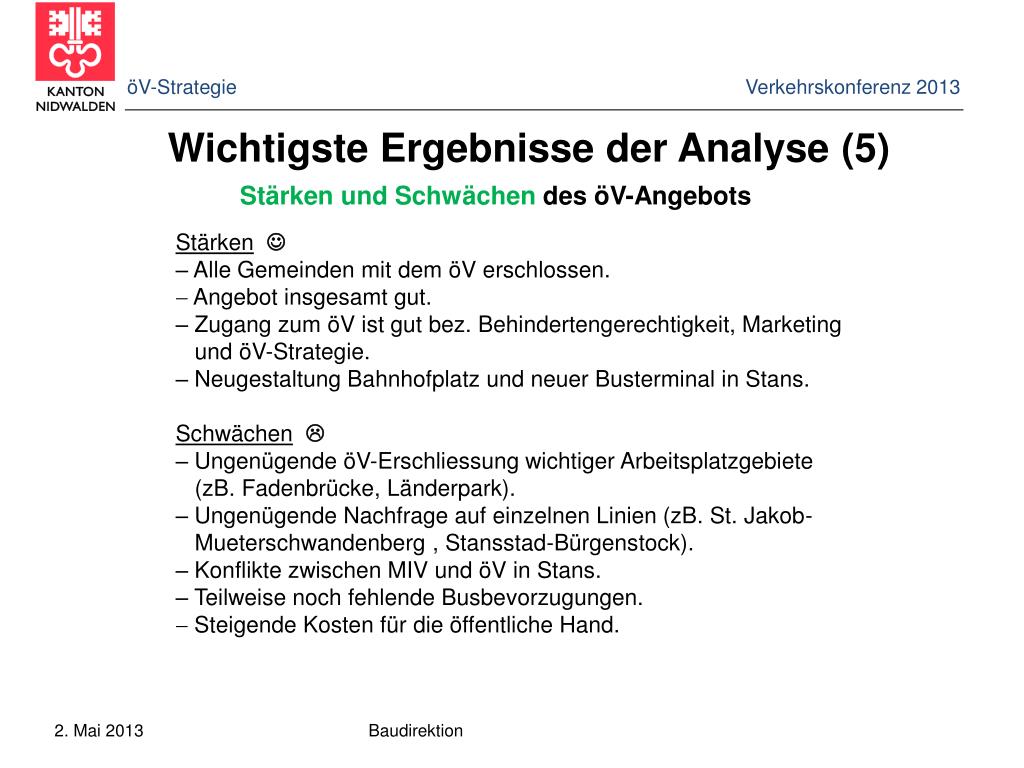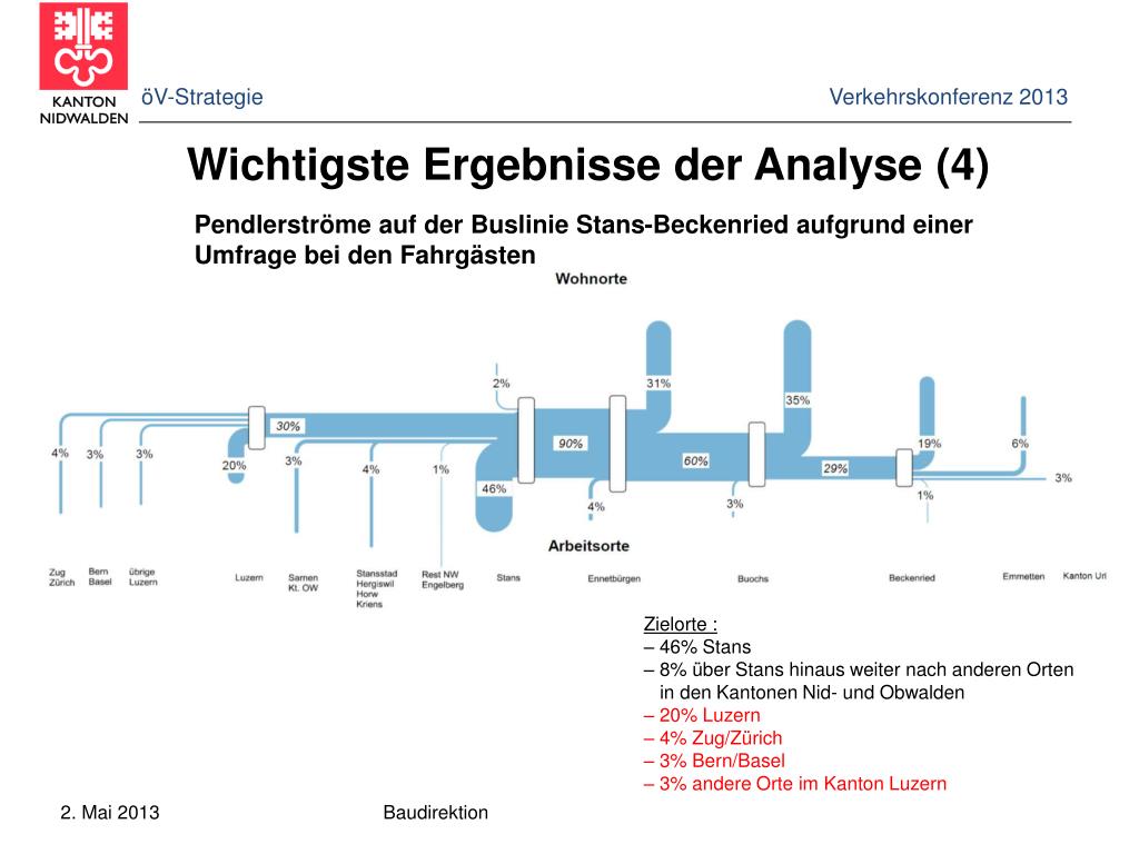 öV-Strategie Verkehrskonferenz 2013 Wichtigste Ergebnisse der Analyse (4) Pendlerströme auf der Buslinie Stans-Beckenried aufgrund einer Umfrage bei den Fahrgästen Zielorte : – 46% Stans – 8% über Stans hinaus weiter nach anderen Orten in den Kantonen Nid- und Obwalden – 20% Luzern – 4% Zug/Zürich – 3% Bern/Basel – 3% andere Orte im Kanton Luzern 2. Mai 2013 Baudirektion