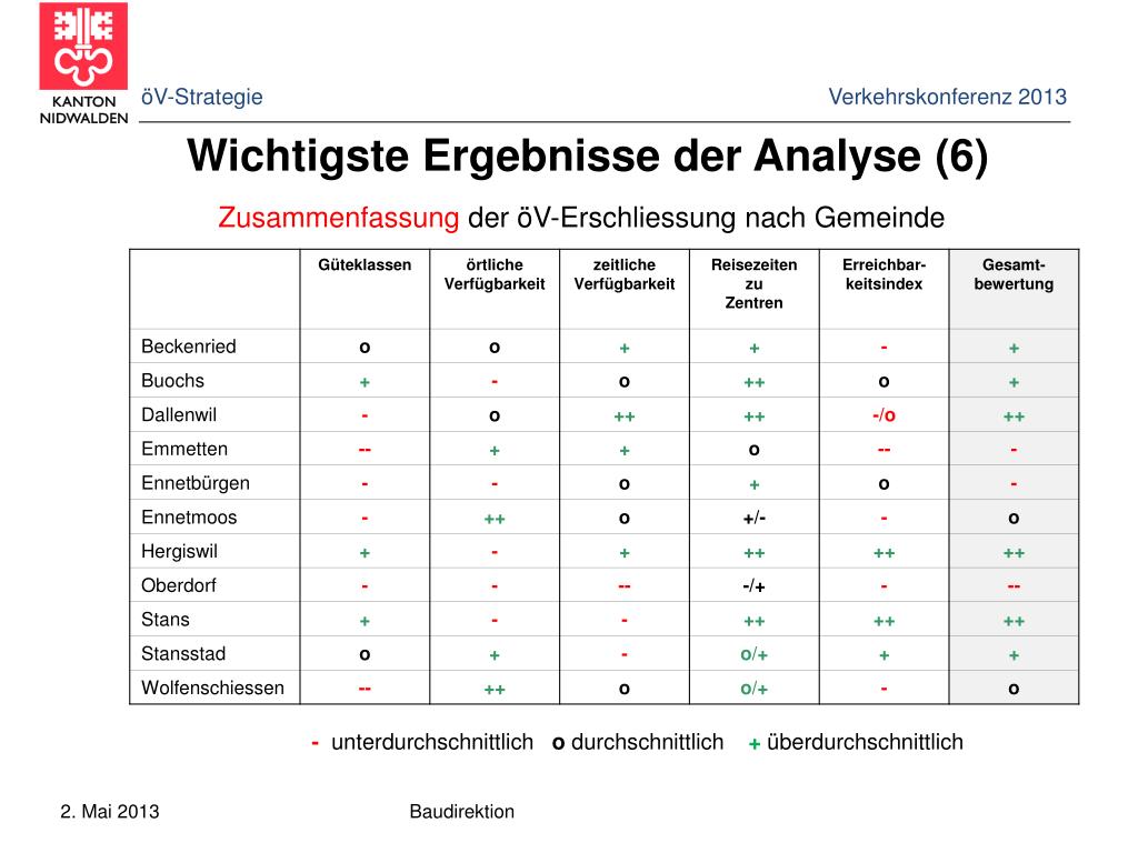 öV-Strategie Verkehrskonferenz 2013 Wichtigste Ergebnisse der Analyse (6) Zusammenfassung der öV-Erschliessung nach Gemeinde - unterdurchschnittlich o durchschnittlich + überdurchschnittlich 2. Mai 2013 Baudirektion