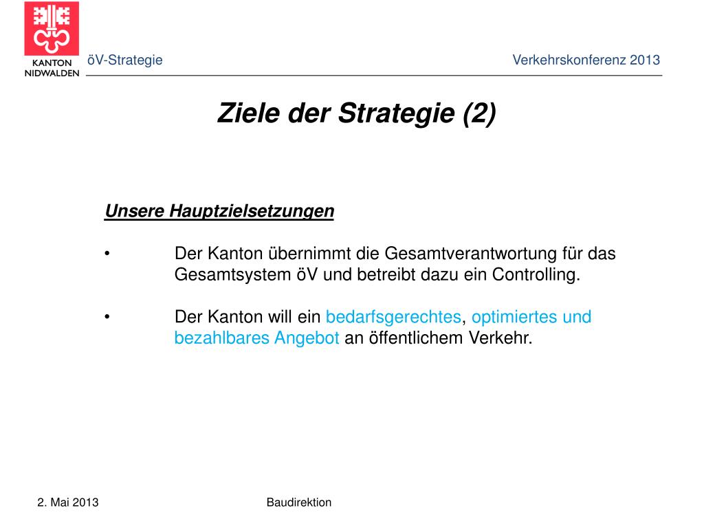 öV-Strategie Verkehrskonferenz 2013 Ziele der Strategie (2) • Unsere Hauptzielsetzungen • Der Kanton übernimmt die Gesamtverantwortung für das • Gesamtsystem öV und betreibt dazu ein Controlling. • Der Kanton will ein bedarfsgerechtes, optimiertes und • bezahlbares Angebot an öffentlichem Verkehr. 2. Mai 2013 Baudirektion