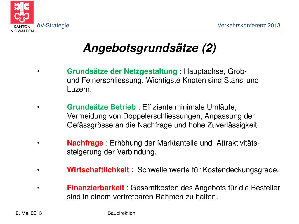 öV-Strategie Verkehrskonferenz 2013 Angebotsgrundsätze (2) • Grundsätze der Netzgestaltung : Hauptachse, Grob- und Feinerschliessung. Wichtigste Knoten sind Stans und Luzern. • Grundsätze Betrieb: Effiziente minimale Umläufe, Vermeidung von Doppelerschliessungen, Anpassung der Gefässgrösse an die Nachfrage und hohe Zuverlässigkeit. • Nachfrage:Erhöhung der Marktanteile und Attraktivitäts- steigerung der Verbindung. • Wirtschaftlichkeit : Schwellenwerte für Kostendeckungsgrade. • Finanzierbarkeit :Gesamtkosten des Angebots für die Besteller • sind in einem vertretbaren Rahmen zu halten. 2. Mai 2013 Baudirektion