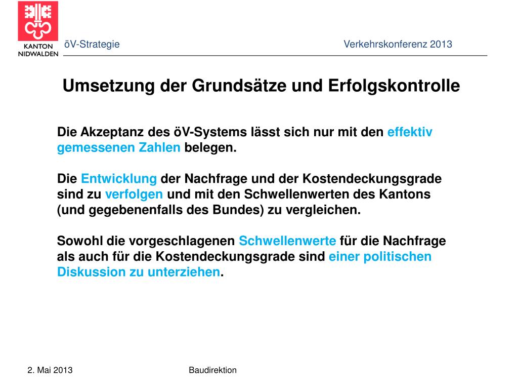 öV-Strategie Verkehrskonferenz 2013 Umsetzung der Grundsätze und Erfolgskontrolle Die Akzeptanz des öV-Systems lässt sich nur mit den effektiv gemessenen Zahlen belegen. Die Entwicklung der Nachfrage und der Kostendeckungsgrade sind zu verfolgen und mit den Schwellenwerten des Kantons (und gegebenenfalls des Bundes) zu vergleichen. Sowohl die vorgeschlagenen Schwellenwerte für die Nachfrage als auch für die Kostendeckungsgrade sind einer politischen Diskussion zu unterziehen. 2. Mai 2013 Baudirektion