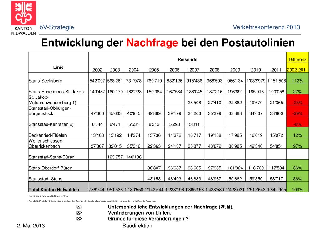 öV-Strategie Verkehrskonferenz 2013 Entwicklung der Nachfrage bei den Postautolinien • Unterschiedliche Entwicklungen der Nachfrage (,). • Veränderungen von Linien. • Gründe für diese Veränderungen ? 2. Mai 2013 Baudirektion