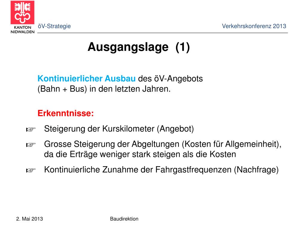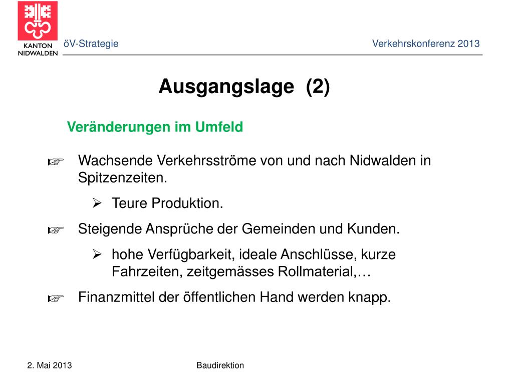öV-Strategie Verkehrskonferenz 2013 Ausgangslage (2) • Veränderungen im Umfeld • Wachsende Verkehrsströme von und nach Nidwalden in Spitzenzeiten. • Teure Produktion. • Steigende Ansprüche der Gemeinden und Kunden. • hohe Verfügbarkeit, ideale Anschlüsse, kurze Fahrzeiten, zeitgemässes Rollmaterial,… • Finanzmittel der öffentlichen Hand werden knapp. 2. Mai 2013 Baudirektion