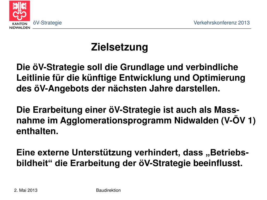 öV-Strategie Verkehrskonferenz 2013 Zielsetzung Die öV-Strategie soll die Grundlage und verbindliche Leitlinie für die künftige Entwicklung und Optimierung des öV-Angebots der nächsten Jahre darstellen. Die Erarbeitung einer öV-Strategie ist auch als Mass- nahme im Agglomerationsprogramm Nidwalden (V-ÖV 1) enthalten. Eine externe Unterstützung verhindert, dass „Betriebs- bildheit“ die Erarbeitung der öV-Strategie beeinflusst. 2. Mai 2013 Baudirektion