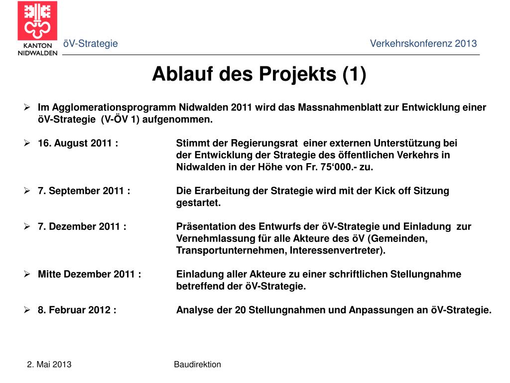 öV-Strategie Verkehrskonferenz 2013 Ablauf des Projekts (1) • Im Agglomerationsprogramm Nidwalden 2011 wird das Massnahmenblatt zur Entwicklung einer öV-Strategie (V-ÖV 1) aufgenommen. • 16. August 2011 : Stimmt der Regierungsrat einer externen Unterstützung bei • der Entwicklung der Strategie des öffentlichen Verkehrs in • Nidwalden in der Höhe von Fr. 75‘000.- zu. • 7. September 2011 : Die Erarbeitung der Strategie wird mit der Kick off Sitzung • gestartet. • 7. Dezember 2011 : Präsentation des Entwurfs der öV-Strategie und Einladung zur Vernehmlassung für alle Akteure des öV (Gemeinden, • Transportunternehmen, Interessenvertreter). • Mitte Dezember 2011 : Einladung aller Akteure zu einer schriftlichen Stellungnahme • betreffend der öV-Strategie. • 8. Februar 2012 : Analyse der 20 Stellungnahmen und Anpassungen an öV-Strategie. 2. Mai 2013 Baudirektion