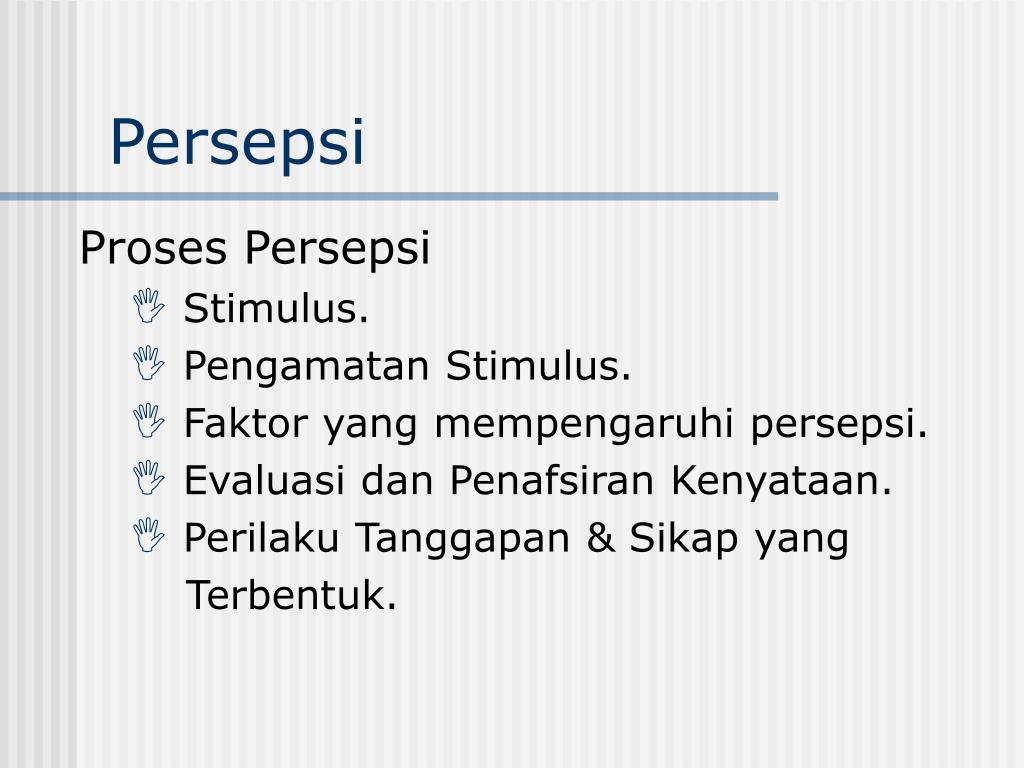 Persepsi Proses Persepsi • Stimulus. • Pengamatan Stimulus. • Faktor yang mempengaruhi persepsi. • Evaluasi dan Penafsiran Kenyataan. • Perilaku Tanggapan & Sikap yang Terbentuk.