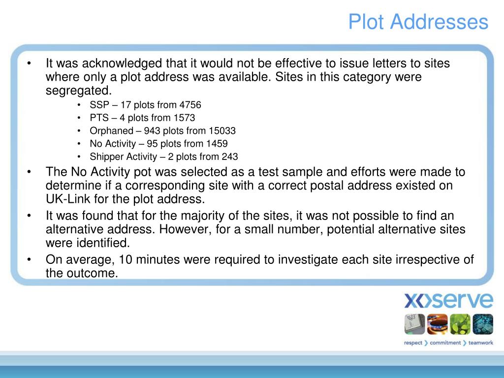 Plot Addresses • It was acknowledged that it would not be effective to issue letters to sites where only a plot address was available. Sites in this category were segregated. • SSP – 17 plots from 4756 • PTS – 4 plots from 1573 • Orphaned – 943 plots from 15033 • No Activity – 95 plots from 1459 • Shipper Activity – 2 plots from 243 • The No Activity pot was selected as a test sample and efforts were made to determine if a corresponding site with a correct postal address existed on UK-Link for the plot address. • It was found that for the majority of the sites, it was not possible to find an alternative address. However, for a small number, potential alternative sites were identified. • On average, 10 minutes were required to investigate each site irrespective of the outcome.