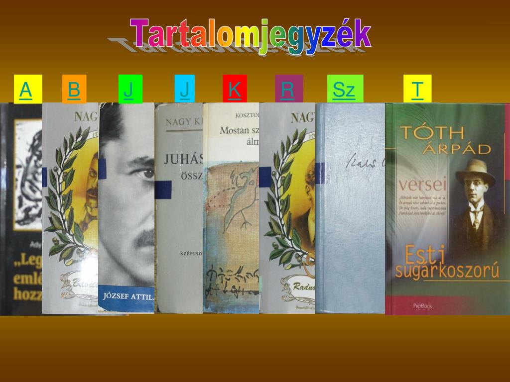Az én Nyugatos költőim. Tóth Árpád. József Attila. Ady Endre. Juhász Gyula. Kosztolányi Dezső. Szabó Lőrinc. Radnóti Miklós. Babits Mihály. Tartalomjegyzék. A. B. J. J. K. R. Sz. T. Tájlíra ajánló.