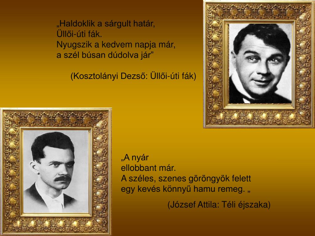 „Haldoklik a sárgult határ,Üllői-úti fák. Nyugszik a kedvem napja már,a szél búsan dúdolva jár” (Kosztolányi Dezső: Üllői-úti fák) „A nyárellobbant már.A széles, szenes göröngyök felettegy kevés könnyű hamu remeg. „ (József Attila: Téli éjszaka)