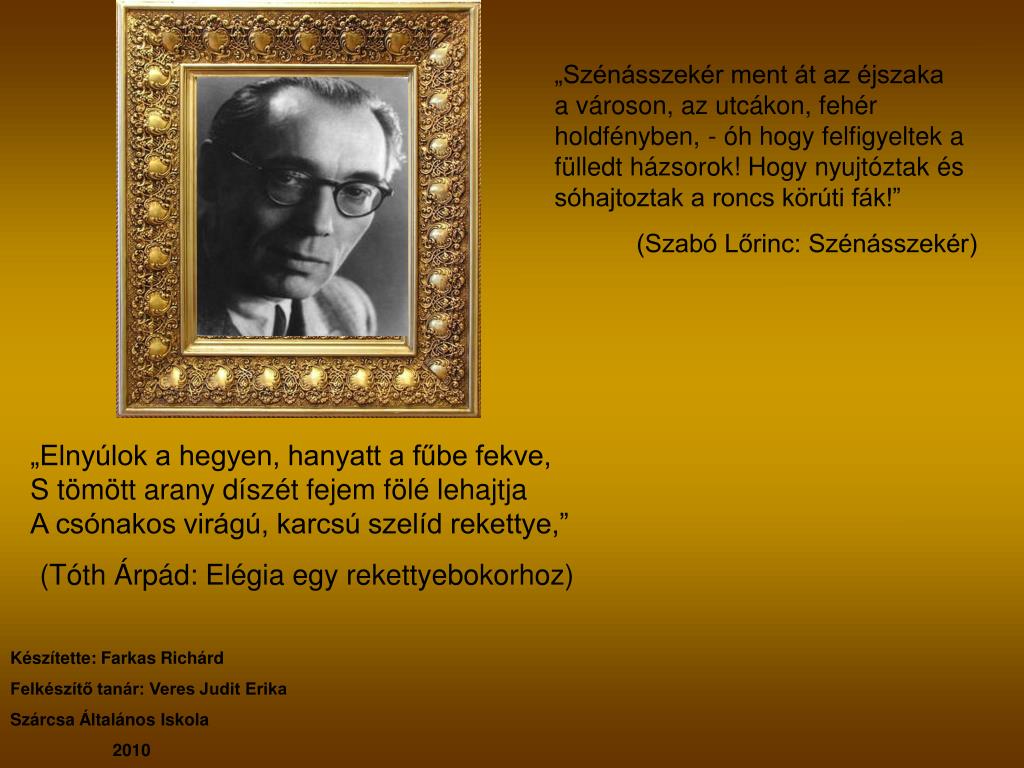 „Szénásszekér ment át az éjszakaa városon, az utcákon, fehér holdfényben, - óh hogy felfigyeltek afülledt házsorok! Hogy nyujtóztak és sóhajtoztak a roncs körúti fák!” (Szabó Lőrinc: Szénásszekér) „Elnyúlok a hegyen, hanyatt a fűbe fekve,S tömött arany díszét fejem fölé lehajtjaA csónakos virágú, karcsú szelíd rekettye,” (Tóth Árpád: Elégia egy rekettyebokorhoz) Készítette: Farkas Richárd Felkészítő tanár: Veres Judit Erika Szárcsa Általános Iskola 2010
