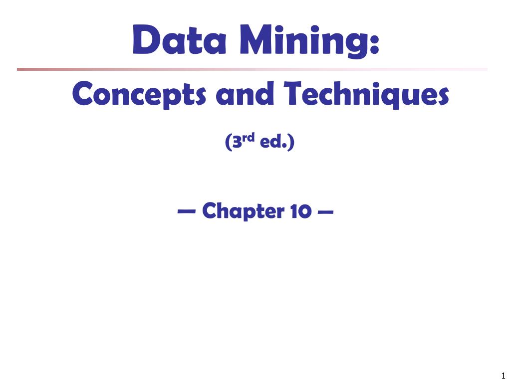 Data Mining: Concepts and Techniques (3 rd ed.) — Chapter 10 —. Chapter 10. Cluster Analysis: Basic Concepts and Methods. Cluster Analysis: Basic Concepts Partitioning Methods Hierarchical Methods Density-Based Methods Grid-Based Methods Evaluation of Clustering Summary. 2. 2.