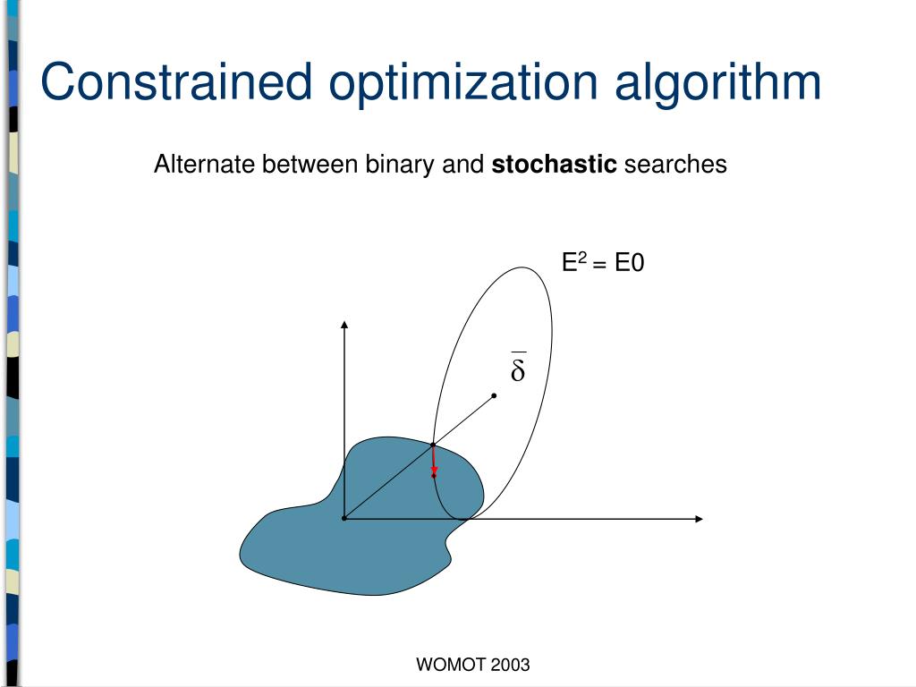 d Constrained optimization algorithm Alternate between binary and stochastic searches E2 = E0 WOMOT 2003