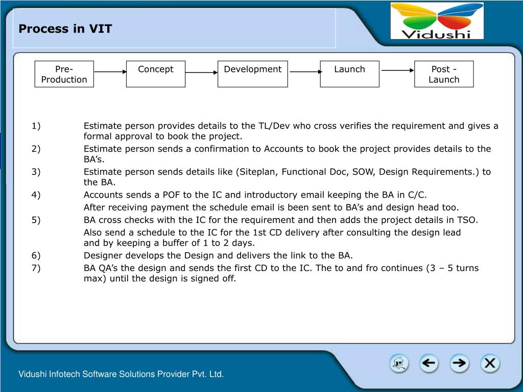 Process in VIT Pre-Production Concept Development Launch Post -Launch 1) Estimate person provides details to the TL/Dev who cross verifies the requirement and gives a formal approval to book the project. 2) Estimate person sends a confirmation to Accounts to book the project provides details to the BA’s. 3) Estimate person sends details like (Siteplan, Functional Doc, SOW, Design Requirements.) to the BA. 4) Accounts sends a POF to the IC and introductory email keeping the BA in C/C. After receiving payment the schedule email is been sent to BA’s and design head too. 5) BA cross checks with the IC for the requirement and then adds the project details in TSO. Also send a schedule to the IC for the 1st CD delivery after consulting the design lead and by keeping a buffer of 1 to 2 days. 6) Designer develops the Design and delivers the link to the BA. 7) BA QA’s the design and sends the first CD to the IC. The to and fro continues (3 – 5 turns max) until the design is signed off. Vidushi Infotech Software Solutions Provider Pvt. Ltd.