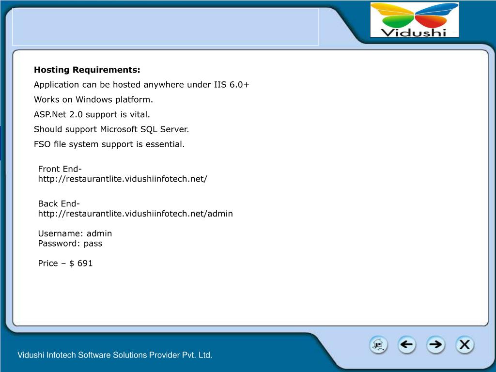 Hosting Requirements: Application can be hosted anywhere under IIS 6.0+ Works on Windows platform. ASP.Net 2.0 support is vital. Should support Microsoft SQL Server. FSO file system support is essential. Front End-http://restaurantlite.vidushiinfotech.net/ Back End-http://restaurantlite.vidushiinfotech.net/admin Username: adminPassword: passPrice – $ 691 Vidushi Infotech Software Solutions Provider Pvt. Ltd.