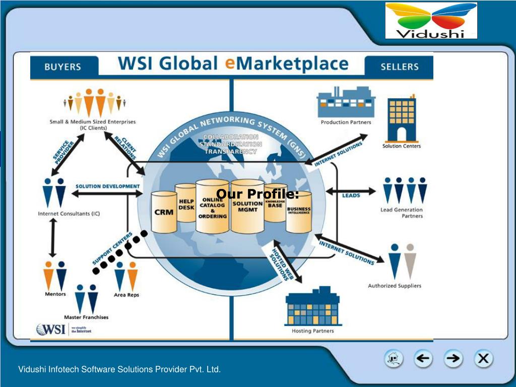 Our Profile: Vidushi InfoTech Software Solutions Provider Pvt. Ltd., WSI Production Center (India) based company, focuses on innovating and enhancing the value chain that assists traditional business models migrate to the networked economy. Our strength is expertise and experience in developing business internet applications as per customer’s requirements. Thus we have a wide product and project showcase with high emphasis on Quality and timely delivery. Today we are: Team Vidushi is of 60+ highly-qualified, talented and innovative individuals. ISO Certified NASSCOM Members STPI MembersOur Future Plans: • Improved process and service levels through ISO 9000. • Offices in UK, USA, Middle East and Australia. • Multi-locational Production Centers in India. (Pune and Ranchi) • Focus on ERP, CRM, Portals and bigger application projects and also planning to deploy our expertise at client-site towards project/application development. Vidushi Infotech Software Solutions Provider Pvt. Ltd.