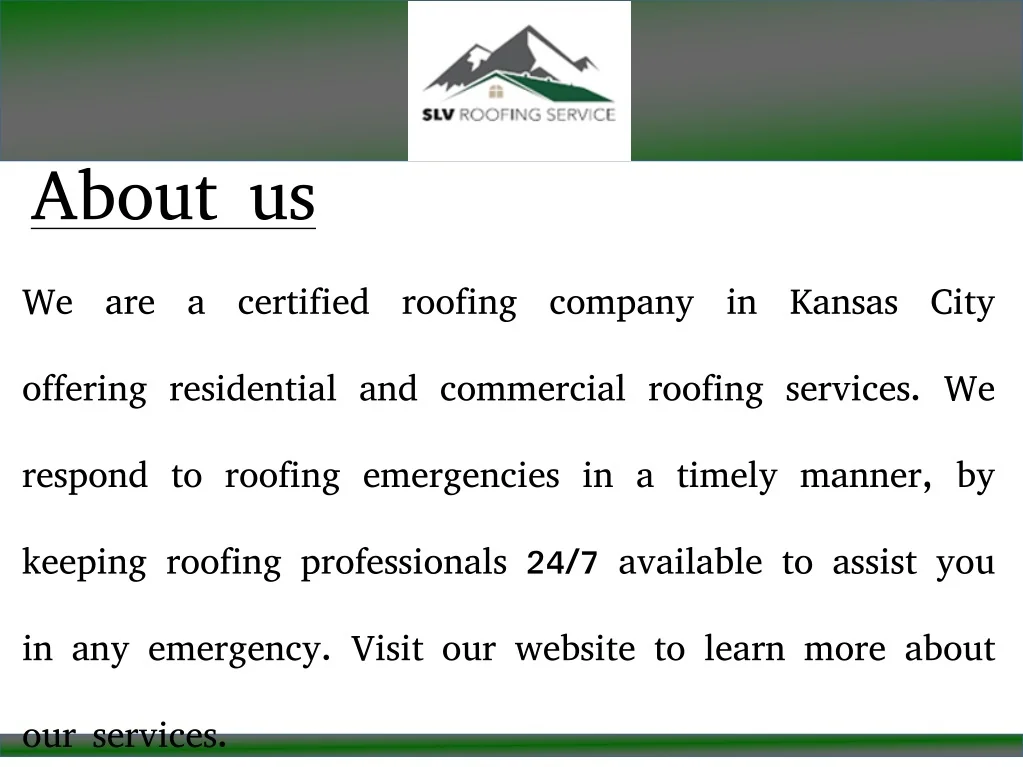 About us We are a certified roofing company in Kansas City offering residential and commercial roofing services. We respond to roofing emergencies in a timely manner, by keeping roofing professionals 24/7 available to assist you in any emergency. Visit our website to learn more about our services.