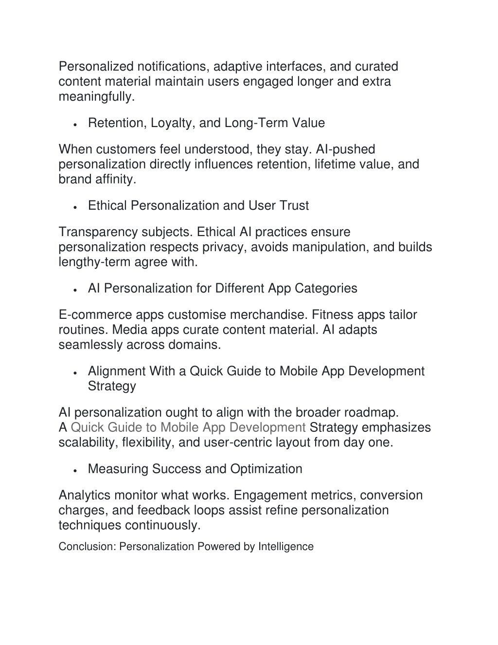 Personalized notifications, adaptive interfaces, and curated content material maintain users engaged longer and extra meaningfully. Retention, Loyalty, and Long-Term Value When customers feel understood, they stay. AI-pushed personalization directly influences retention, lifetime value, and brand affinity. Ethical Personalization and User Trust Transparency subjects. Ethical AI practices ensure personalization respects privacy, avoids manipulation, and builds lengthy-term agree with. AI Personalization for Different App Categories E-commerce apps customise merchandise. Fitness apps tailor routines. Media apps curate content material. AI adapts seamlessly across domains. Alignment With a Quick Guide to Mobile App Development Strategy AI personalization ought to align with the broader roadmap. A Quick Guide to Mobile App Development Strategy emphasizes scalability, flexibility, and user-centric layout from day one. Measuring Success and Optimization Analytics monitor what works. Engagement metrics, conversion charges, and feedback loops assist refine personalization techniques continuously. Conclusion: Personalization Powered by Intelligence