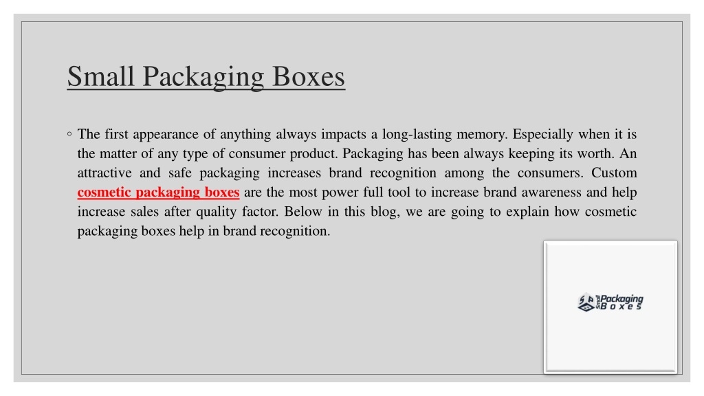 Small Packaging Boxes • The first appearance of anything always impacts a long-lasting memory. Especially when it is the matter of any type of consumer product. Packaging has been always keeping its worth. An attractive and safe packaging increases brand recognition among the consumers. Custom cosmetic packaging boxesare the most power full tool to increase brand awareness and help increase sales after quality factor. Below in this blog, we are going to explain how cosmetic packaging boxes help in brand recognition.