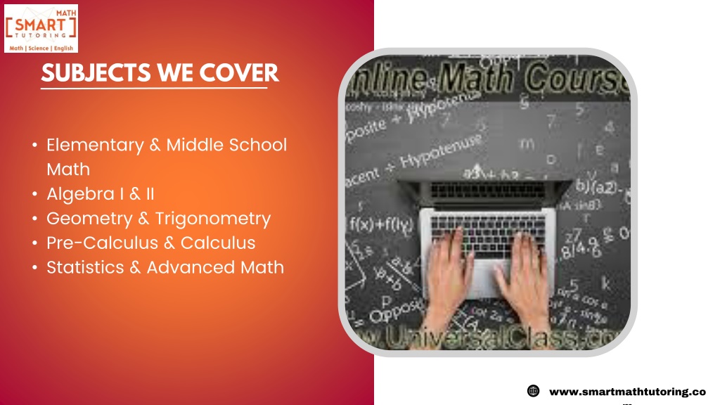 3. www.smartmathtutoring.com SUBJECTS WE COVER • Elementary & Middle School Math • Algebra I & II • Geometry & Trigonometry • Pre-Calculus & Calculus • Statistics & Advanced Math
