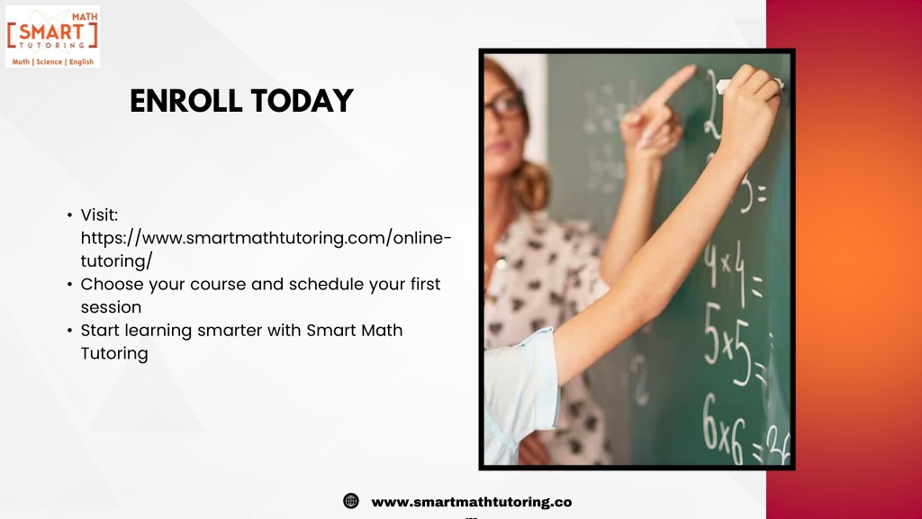 8. www.smartmathtutoring.com ENROLL TODAY • Visit: https://www.smartmathtutoring.com/online-tutoring/ • Choose your course and schedule your first session • Start learning smarter with Smart Math Tutoring