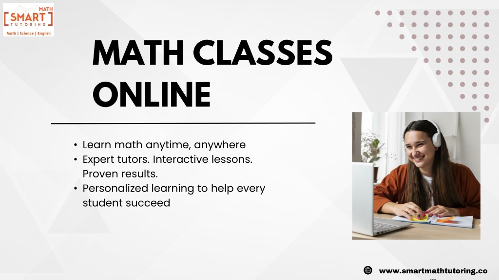 1. www.smartmathtutoring.com MATH CLASSES ONLINE • Learn math anytime, anywhere • Expert tutors. Interactive lessons. Proven results. • Personalized learning to help every student succeed