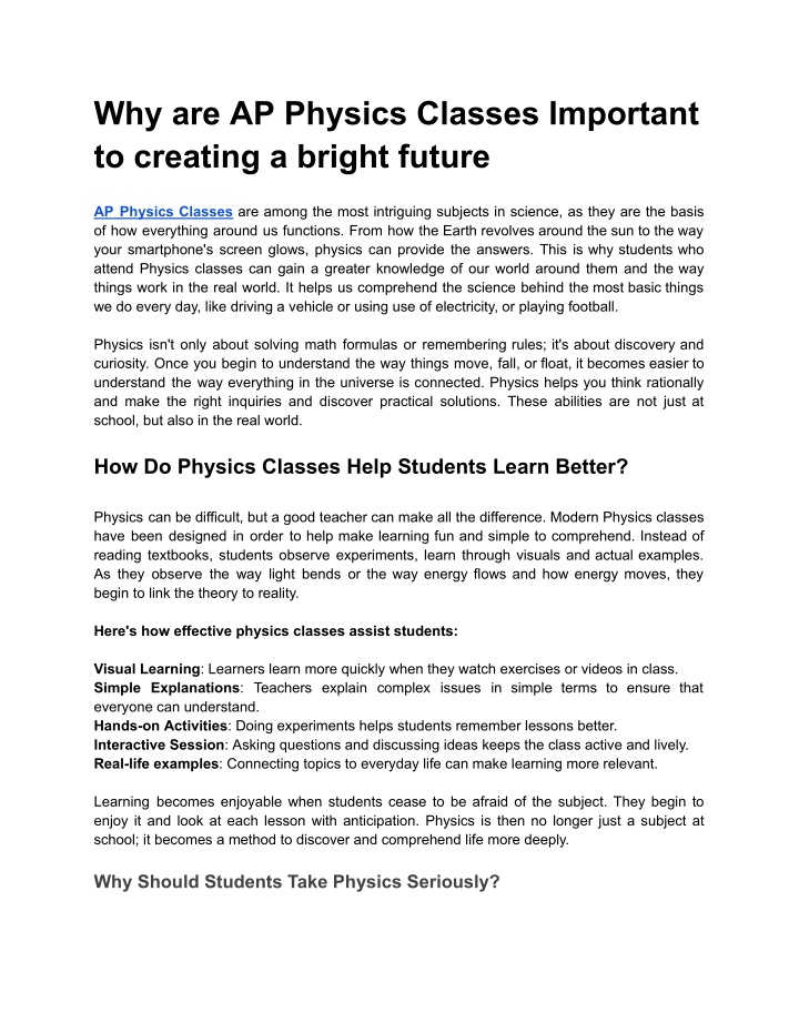 Why are AP Physics Classes Important to creating a bright future AP Physics Classesare among the most intriguing subjects in science, as they are the basis of how everything around us functions. From how the Earth revolves around the sun to the way your smartphone's screen glows, physics can provide the answers. This is why students who attend Physics classes can gain a greater knowledge of our world around them and the way things work in the real world. It helps us comprehend the science behind the most basic things we do every day, like driving a vehicle or using use of electricity, or playing football. Physics isn't only about solving math formulas or remembering rules; it's about discovery and curiosity. Once you begin to understand the way things move, fall, or float, it becomes easier to understand the way everything in the universe is connected. Physics helps you think rationally and make the right inquiries and discover practical solutions. These abilities are not just at school, but also in the real world. How Do Physics Classes Help Students Learn Better? Physics can be difficult, but a good teacher can make all the difference. Modern Physics classes have been designed in order to help make learning fun and simple to comprehend. Instead of reading textbooks, students observe experiments, learn through visuals and actual examples. As they observe the way light bends or the way energy flows and how energy moves, they begin to link the theory to reality. Here's how effective physics classes assist students: Visual Learning: Learners learn more quickly when they watch exercises or videos in class. Simple Explanations: Teachers explain complex issues in simple terms to ensure that everyone can understand. Hands-on Activities: Doing experiments helps students remember lessons better. Interactive Session: Asking questions and discussing ideas keeps the class active and lively. Real-life examples: Connecting topics to everyday life can make learning more relevant. Learning becomes enjoyable when students cease to be afraid of the subject. They begin to enjoy it and look at each lesson with anticipation. Physics is then no longer just a subject at school; it becomes a method to discover and comprehend life more deeply. Why Should Students Take Physics Seriously?