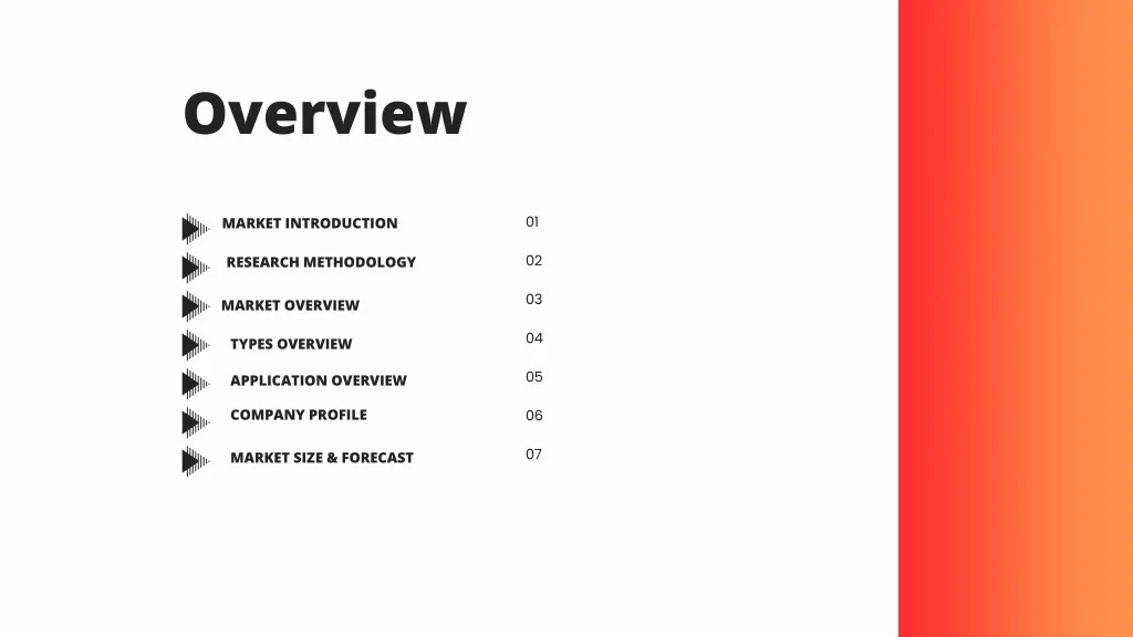 Overview 01 MARKET INTRODUCTION 02 RESEARCH METHODOLOGY 03 MARKET OVERVIEW 04 TYPES OVERVIEW 05 APPLICATION OVERVIEW COMPANY PROFILE 06 07 MARKET SIZE & FORECAST