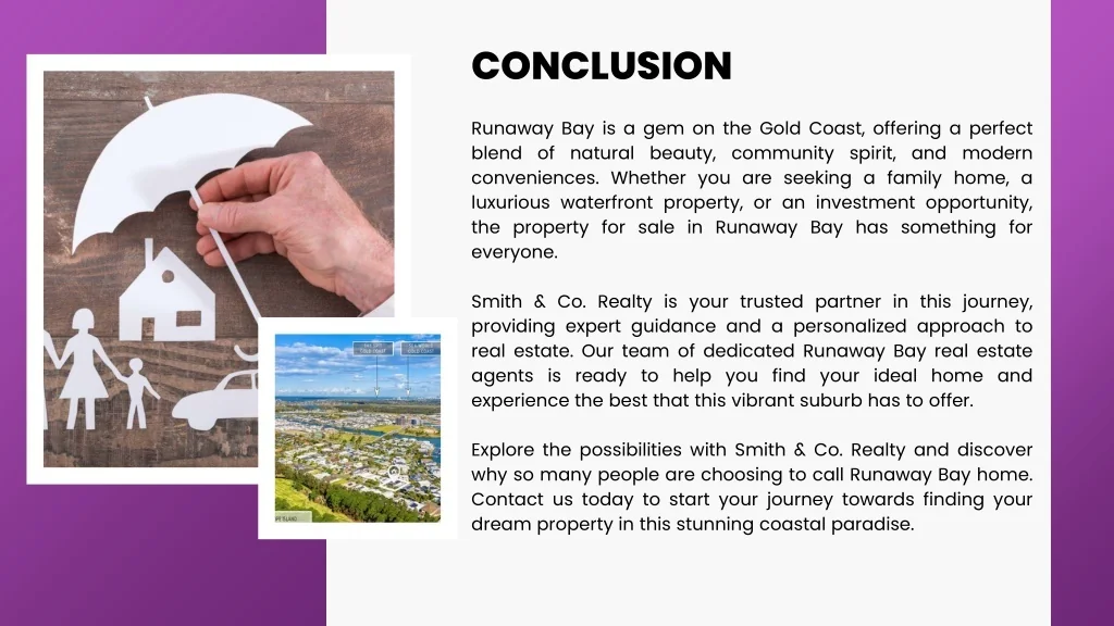 CONCLUSION Runaway Bay is a gem on the Gold Coast, offering a perfect blend of natural beauty, community spirit, and modern conveniences. Whether you are seeking a family home, a luxurious waterfront property, or an investment opportunity, the property for sale in Runaway Bay has something for everyone. Smith & Co. Realty is your trusted partner in this journey, providing expert guidance and a personalized approach to real estate. Our team of dedicated Runaway Bay real estate agents is ready to help you find your ideal home and experience the best that this vibrant suburb has to offer. Explore the possibilities with Smith & Co. Realty and discover why so many people are choosing to call Runaway Bay home. Contact us today to start your journey towards finding your dream property in this stunning coastal paradise.