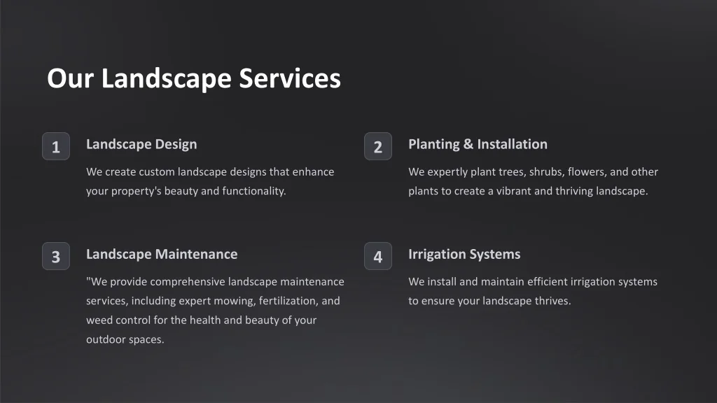 Our Landscape Services Landscape Design Planting & Installation 1 2 We create custom landscape designs that enhance your property's beauty and functionality. We expertly plant trees, shrubs, flowers, and other plants to create a vibrant and thriving landscape. Landscape Maintenance Irrigation Systems 3 4 "We provide comprehensive landscape maintenance services, including expert mowing, fertilization, and weed control for the health and beauty of your outdoor spaces. We install and maintain efficient irrigation systems to ensure your landscape thrives.