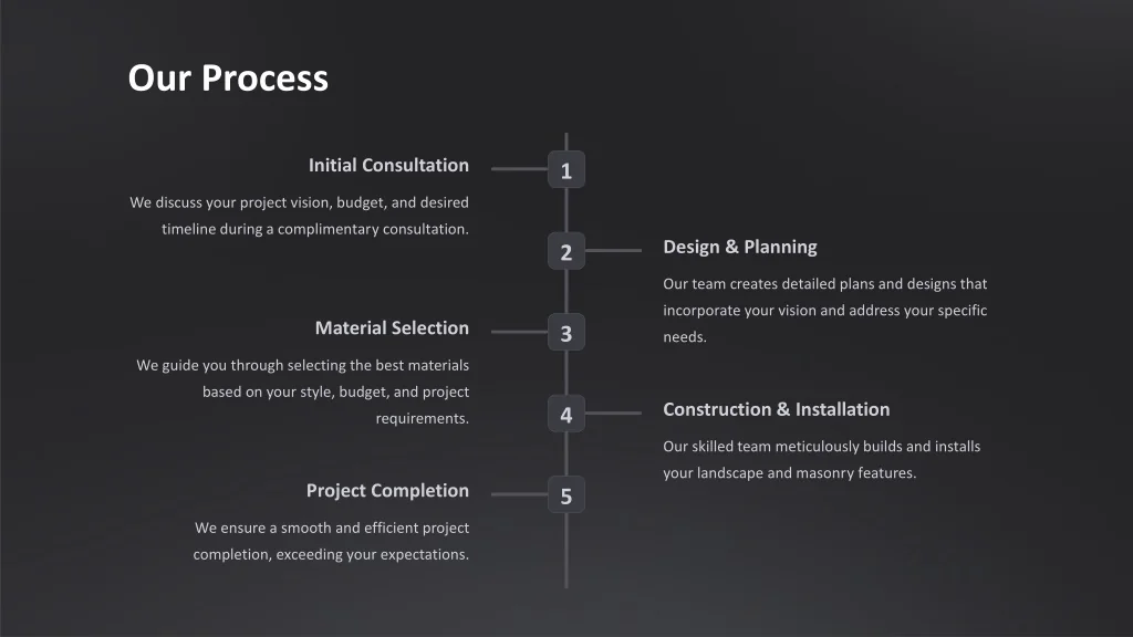 Our Process Initial Consultation 1 We discuss your project vision, budget, and desired timeline during a complimentary consultation. Design & Planning 2 Our team creates detailed plans and designs that incorporate your vision and address your specific needs. Material Selection 3 We guide you through selecting the best materials based on your style, budget, and project requirements. Construction & Installation 4 Our skilled team meticulously builds and installs your landscape and masonry features. Project Completion 5 We ensure a smooth and efficient project completion, exceeding your expectations.