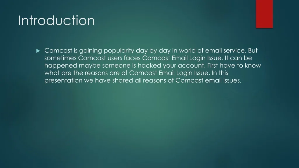 Introduction • Comcast is gaining popularity day by day in world of email service. But sometimes Comcast users faces Comcast Email Login Issue. It can be happened maybe someone is hacked your account. First have to know what are the reasons are of Comcast Email Login Issue. In this presentation we have shared all reasons of Comcast email issues.
