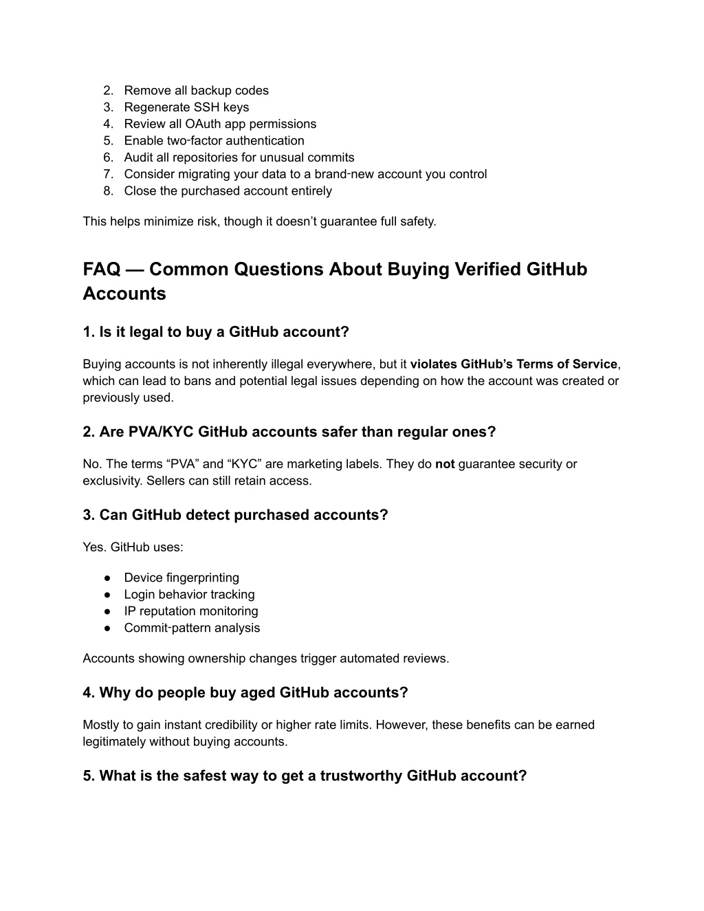 6. 2. Remove all backup codes 3. Regenerate SSH keys 4. Review all OAuth app permissions 5. Enable two‑factor authentication 6. Audit all repositories for unusual commits 7. Consider migrating your data to a brand‑new account you control 8. Close the purchased account entirely This helps minimize risk, though it doesn’t guarantee full safety. FAQ — Common Questions About Buying Verified GitHub Accounts 1. Is it legal to buy a GitHub account? Buying accounts is not inherently illegal everywhere, but it violates GitHub’s Terms of Service, which can lead to bans and potential legal issues depending on how the account was created or previously used. 2. Are PVA/KYC GitHub accounts safer than regular ones? No. The terms “PVA” and “KYC” are marketing labels. They do not guarantee security or exclusivity. Sellers can still retain access. 3. Can GitHub detect purchased accounts? Yes. GitHub uses: ● Device fingerprinting ● Login behavior tracking ● IP reputation monitoring ● Commit‑pattern analysis Accounts showing ownership changes trigger automated reviews. 4. Why do people buy aged GitHub accounts? Mostly to gain instant credibility or higher rate limits. However, these benefits can be earned legitimately without buying accounts. 5. What is the safest way to get a trustworthy GitHub account?