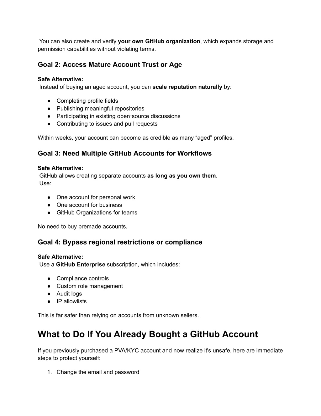 5. You can also create and verify your own GitHub organization, which expands storage and permission capabilities without violating terms. Goal 2: Access Mature Account Trust or Age Safe Alternative: Instead of buying an aged account, you can scale reputation naturally by: ● Completing profile fields ● Publishing meaningful repositories ● Participating in existing open‑source discussions ● Contributing to issues and pull requests Within weeks, your account can become as credible as many “aged” profiles. Goal 3: Need Multiple GitHub Accounts for Workflows Safe Alternative: GitHub allows creating separate accounts as long as you own them. Use: ● One account for personal work ● One account for business ● GitHub Organizations for teams No need to buy premade accounts. Goal 4: Bypass regional restrictions or compliance Safe Alternative: Use a GitHub Enterprise subscription, which includes: ● Compliance controls ● Custom role management ● Audit logs ● IP allowlists This is far safer than relying on accounts from unknown sellers. What to Do If You Already Bought a GitHub Account If you previously purchased a PVA/KYC account and now realize it's unsafe, here are immediate steps to protect yourself: 1. Change the email and password