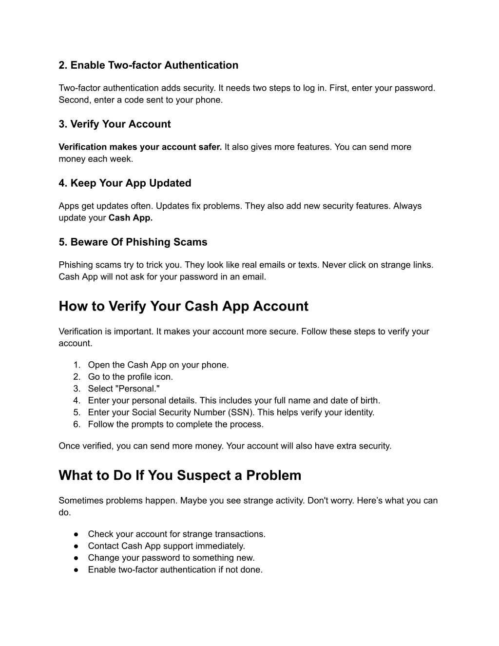 2. Enable Two-factor Authentication Two-factor authentication adds security. It needs two steps to log in. First, enter your password. Second, enter a code sent to your phone. 3. Verify Your Account Verification makes your account safer. It also gives more features. You can send more money each week. 4. Keep Your App Updated Apps get updates often. Updates fix problems. They also add new security features. Always update your Cash App. 5. Beware Of Phishing Scams Phishing scams try to trick you. They look like real emails or texts. Never click on strange links. Cash App will not ask for your password in an email. How to Verify Your Cash App Account Verification is important. It makes your account more secure. Follow these steps to verify your account. 1. Open the Cash App on your phone. 2. Go to the profile icon. 3. Select "Personal." 4. Enter your personal details. This includes your full name and date of birth. 5. Enter your Social Security Number (SSN). This helps verify your identity. 6. Follow the prompts to complete the process. Once verified, you can send more money. Your account will also have extra security. What to Do If You Suspect a Problem Sometimes problems happen. Maybe you see strange activity. Don't worry. Here’s what you can do. ● Check your account for strange transactions. ● Contact Cash App support immediately. ● Change your password to something new. ● Enable two-factor authentication if not done.