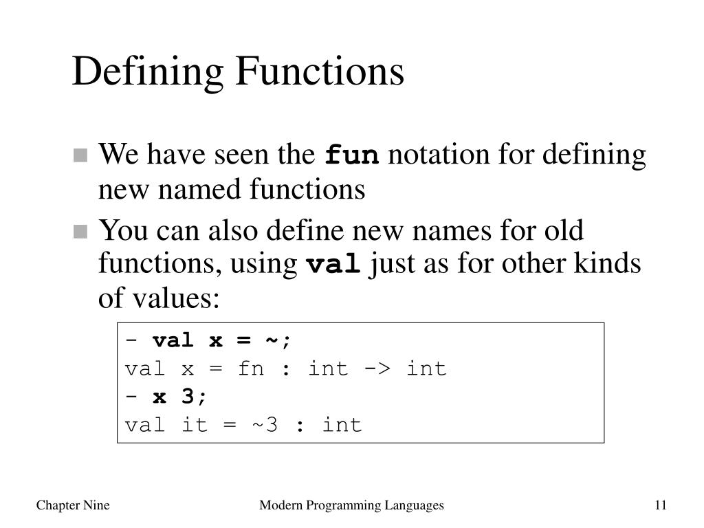 Defining Functions • We have seen the fun notation for defining new named functions • You can also define new names for old functions, using val just as for other kinds of values: - val x = ~;val x = fn : int -> int- x 3;val it = ~3 : int Modern Programming Languages