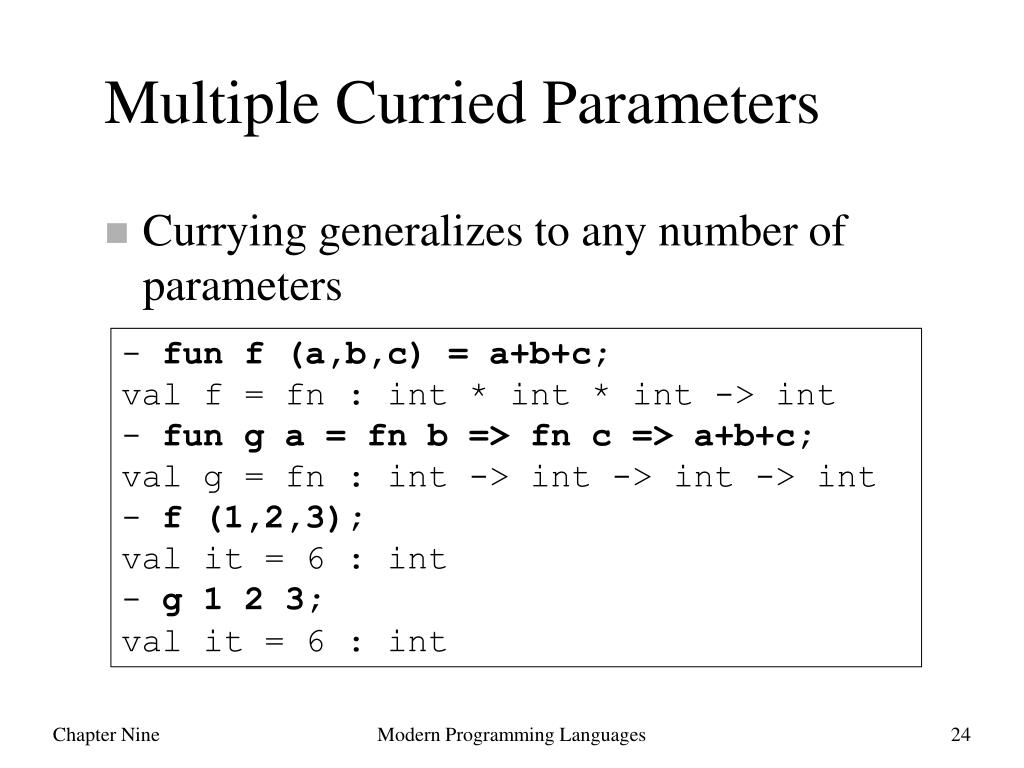 Multiple Curried Parameters • Currying generalizes to any number of parameters - fun f (a,b,c) = a+b+c;val f = fn : int * int * int -> int- fun g a = fn b => fn c => a+b+c;val g = fn : int -> int -> int -> int- f (1,2,3);val it = 6 : int- g 1 2 3;val it = 6 : int Modern Programming Languages