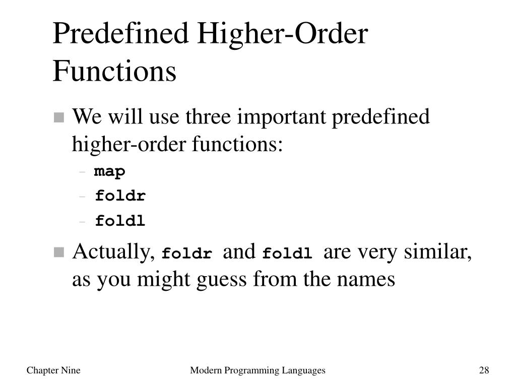 Predefined Higher-Order Functions • We will use three important predefined higher-order functions: • map • foldr • foldl • Actually, foldr and foldl are very similar, as you might guess from the names Modern Programming Languages
