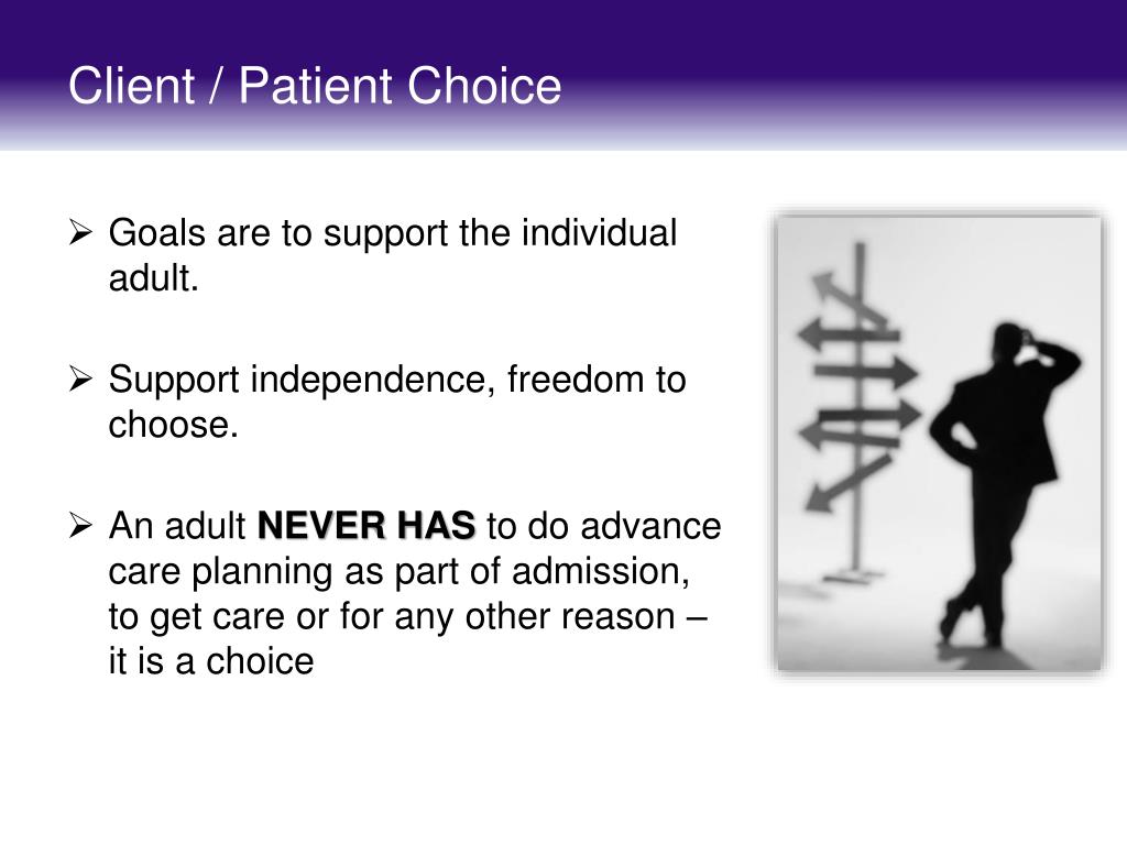 Client / Patient Choice Goals are to support the individual adult. Support independence, freedom to choose. An adult NEVER HAS to do advance care planning as part of admission, to get care or for any other reason – it is a choice