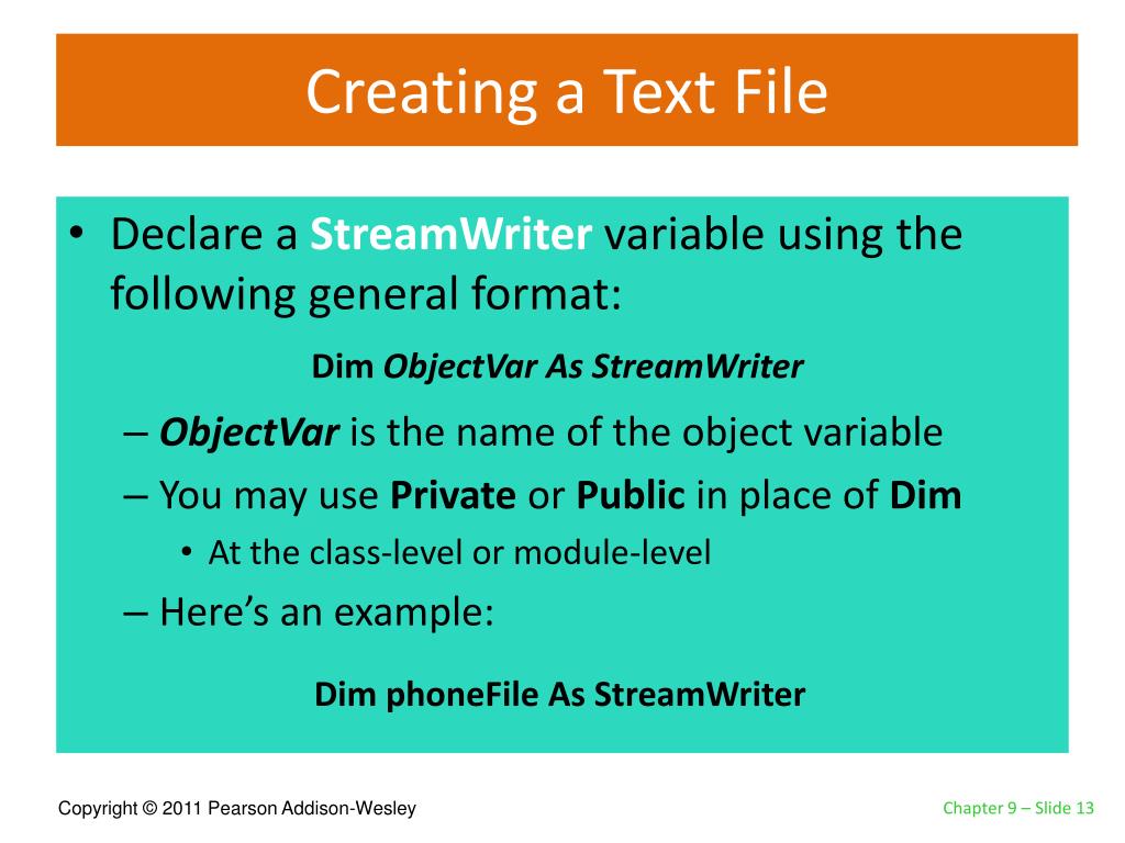 Creating a Text File • Declare a StreamWriter variable using the following general format: • ObjectVaris the name of the object variable • You may use Private or Public in place of Dim • At the class-level or module-level • Here’s an example: Dim ObjectVar As StreamWriter Dim phoneFile As StreamWriter