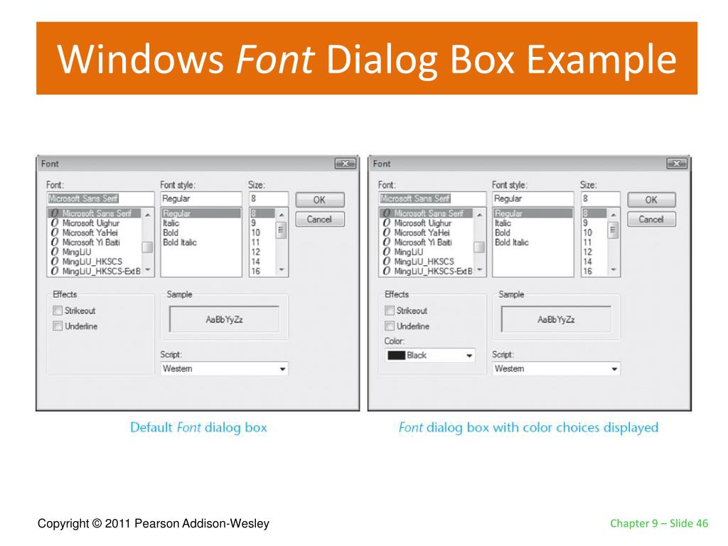The FontDialog Control • The FontDialogcontrol displays a standard Windows FontDialog box • To place a FontDialogcontrol on a form • Double-click the FontDialogicon in the Dialogs section of the Toolbox • Control appears in the component tray • Use the prefix fdwhen naming the control • To display a Color dialog box, call the ShowDialog method • Returns one of the following values • Windows.Forms.DialogResult.OK • Windows.Forms.DiallogResult.Cancel