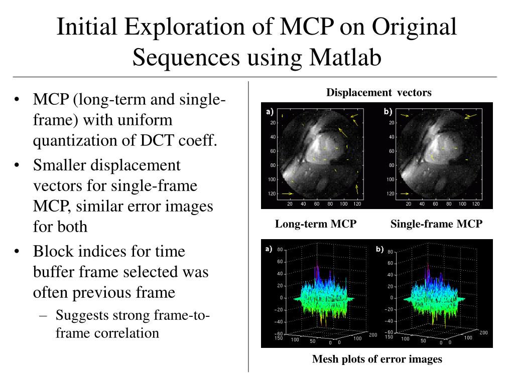 Initial Exploration of MCP on Original Sequences using Matlab Displacementvectors • MCP (long-term and single-frame) with uniform quantization of DCT coeff. • Smaller displacement vectors for single-frame MCP, similar error images for both • Block indices for time buffer frame selected was often previous frame • Suggests strong frame-to-frame correlation Long-term MCP Single-frame MCP Mesh plots of error images