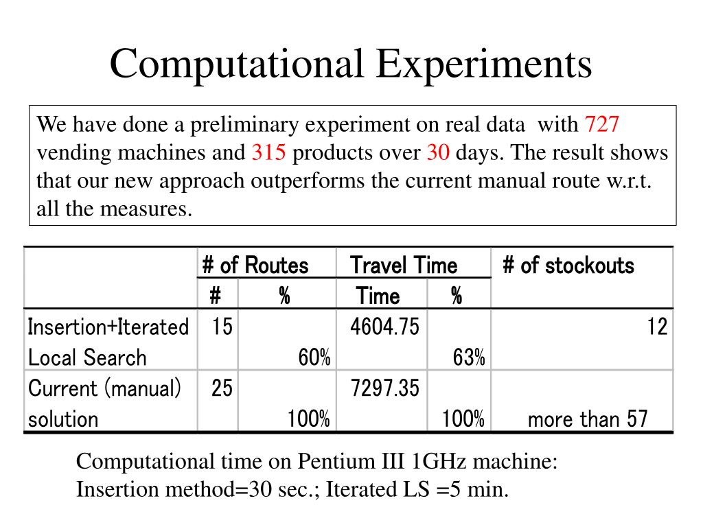 Computational Experiments We have done a preliminary experiment on real data with 727 vending machines and 315 products over 30 days. The result shows that our new approach outperforms the current manual route w.r.t. all the measures. Computational time on Pentium III 1GHz machine: Insertion method=30 sec.; Iterated LS =5 min.